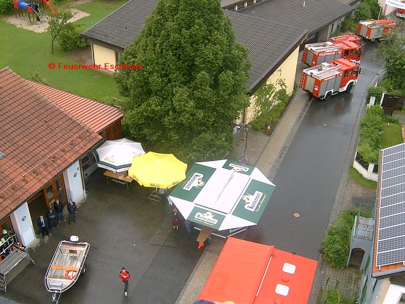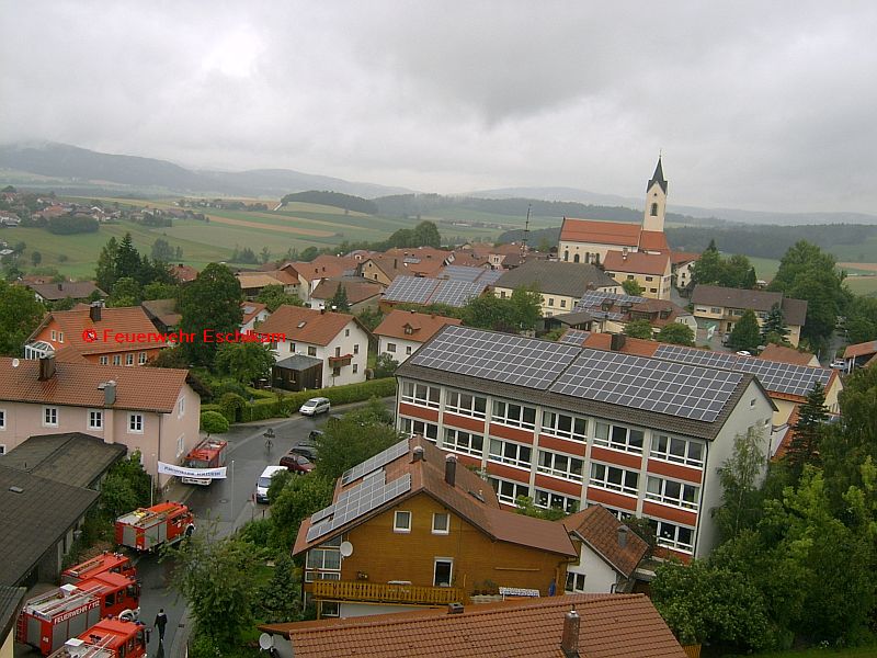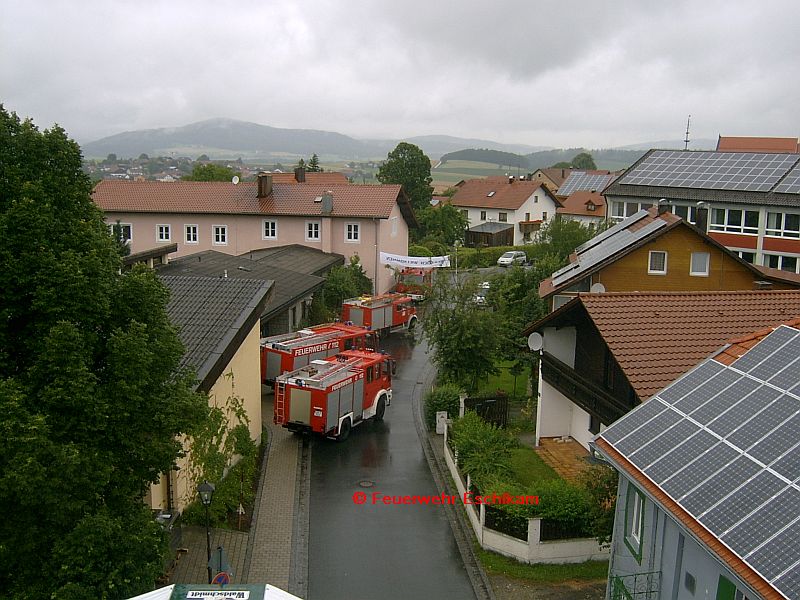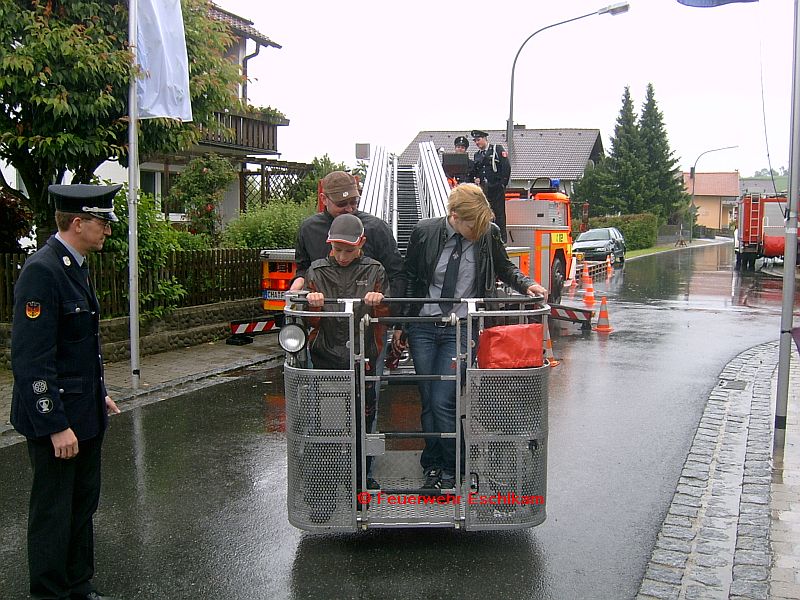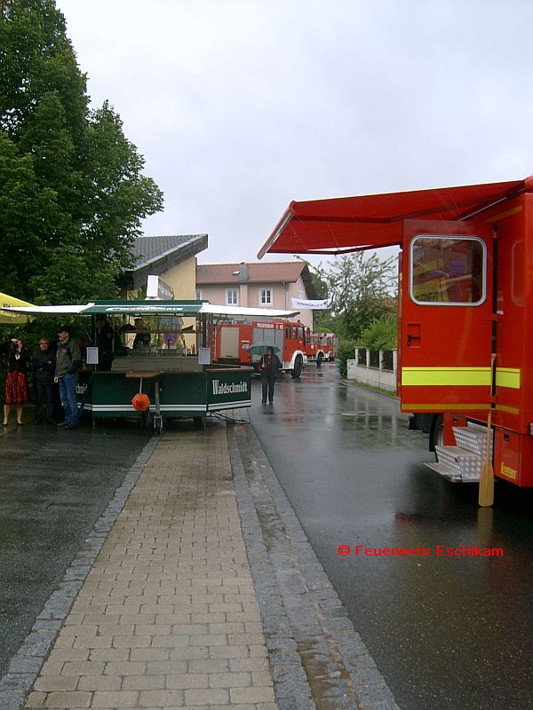 Leider meinte das Wetter es nicht besonders gut mit den Eschlkamer Feuerwehrmännern. Es goss den ganzen Tag wie aus Eimern, so dass die geplanten Vorführungen ins Wasser fielen. Die Lamer Kollegen ließen es sich aber nicht nehmen mit ihrer neuen Drehleiter Fahrten in den verregneten Himmel anzubieten. Viele Interessierte nutzten die Gelegenheit, um einen Rundblick über Eschlkam aus der Vogelperspektive zu erleben. Die Kameraden aus Furth im Wald stellten den Gerätewagen-Atem-/Strahlenschutz vor, der auch gut besucht war. Die Fahrzeuge der Feuerwehren Großaign, Kleinaign, Schwarzenberg, Stachesried, Warzenried und Kdynè konnten besichtigt werden.
