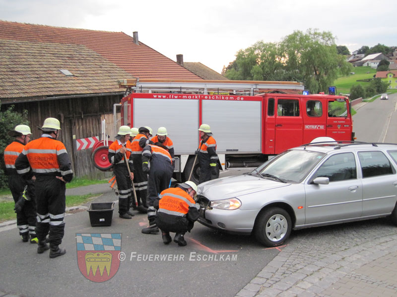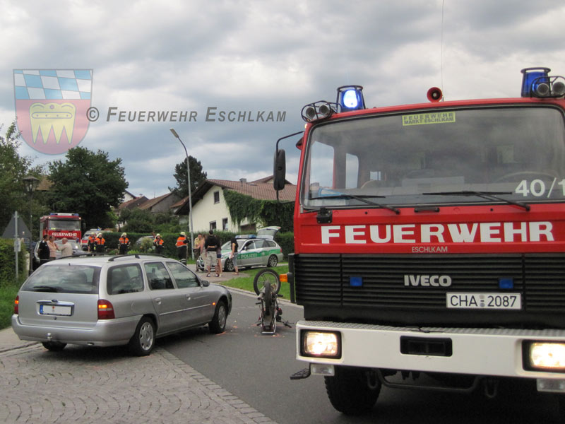 Von der Polizei wird die Feuerwehr Eschlkam angefordert, um auslaufende Kraftstoffe des Mofas zu binden. Dazu wird der Verkehr kurzzeitig umgeleitet.
